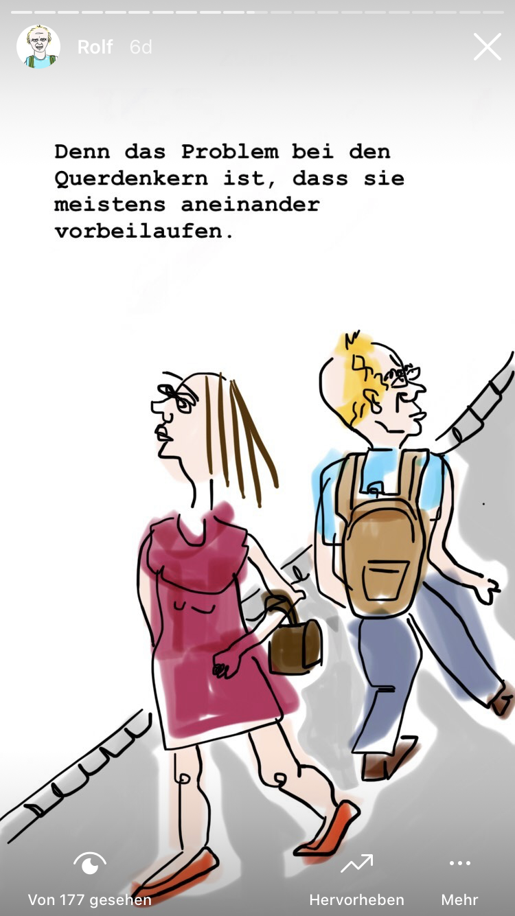 Rolf ist Querdenker. Denn wenn Rolf denkt, muss er seinen Kopf quer halten. Dies bereitet ihm seit seiner Kindheit Probleme...